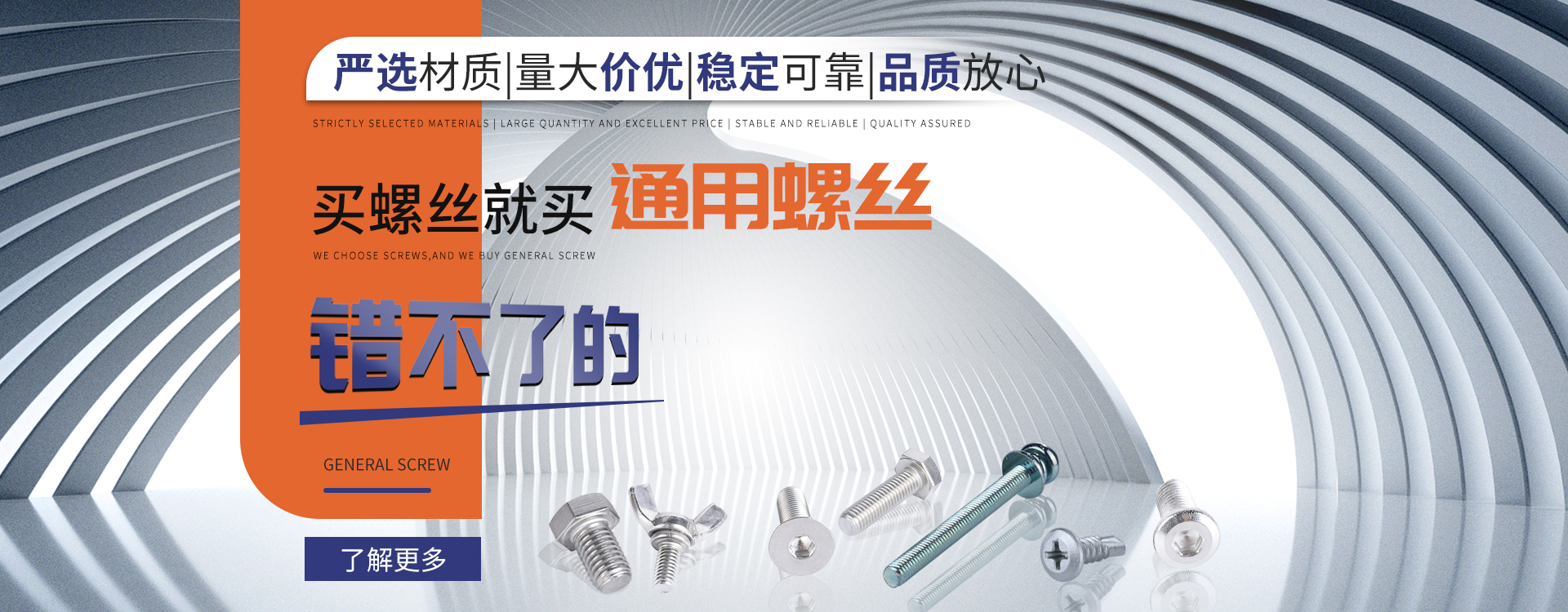 中山市通用螺絲制造有限公司成立于1987年,工廠坐落于廣東四小虎之一的中山市,北連廣州,毗鄰港澳。總占地面積14000m 2,足有兩個足球場。1998年通過德國萊茵TUV ISO9002認證,于2002年通過TUV ISO9001:2000認證。2008年通過ISO 14000認證。我司主營自攻螺絲組合螺絲機械螺絲防松螺絲等標準和非標準件,既可按客戶的要求提交所需的產品,也可為客戶量身定做所需產品。我司擁有專業的產品檢測隊伍和投影分析儀、金相、硬度計(韋氏和洛氏)、扭矩力測試計等完善的檢測設備,為電子、電器、五金塑料、衛浴、家具、機械、汽配等行業提供符合歐盟質量、環保要求的產品2006年,我司自主開發的ERP管理系統,使我們的生產和服務效率得到了極大的提高。 經過三十多年地摸爬滾打,依靠眾多新老顧客的支持,通用螺絲逐漸成長為國內知名的緊固件供應商。了解更多 >>